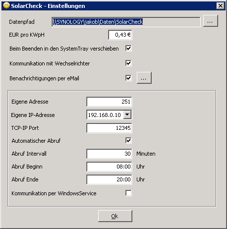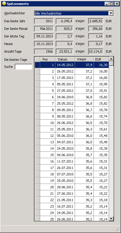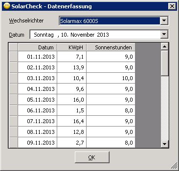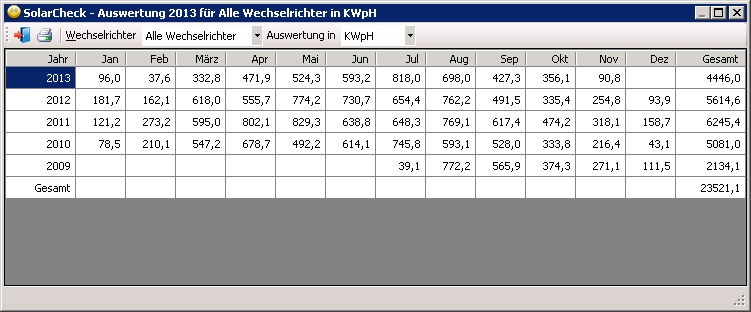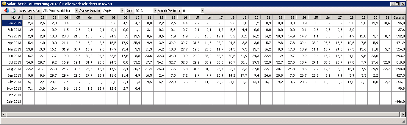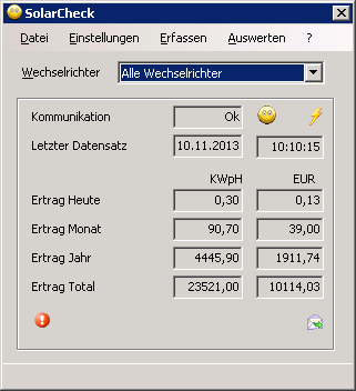 Jetzt sieht es so aus, daß die Daten per Programm oder per Windowsservice vom Wechselrichter ausgelesen und in einer Datenbank gespeichert werden. In den Auswertungsteilen kann man dann den Ertrag eines jeden einzelnen Tages abrufen und sich die Daten in verschiedenen Übersichten anzeigen lassen. Für Fälle in denen die Daten nicht automatisch abgerufen werden können, ist eine manuelle Datenerfassung integriert. Ich bin zufrieden, mir gefällt es. Aber letztendlich gibt es immer wieder Dinge das Programm oder den Ablauf zu verbessern.