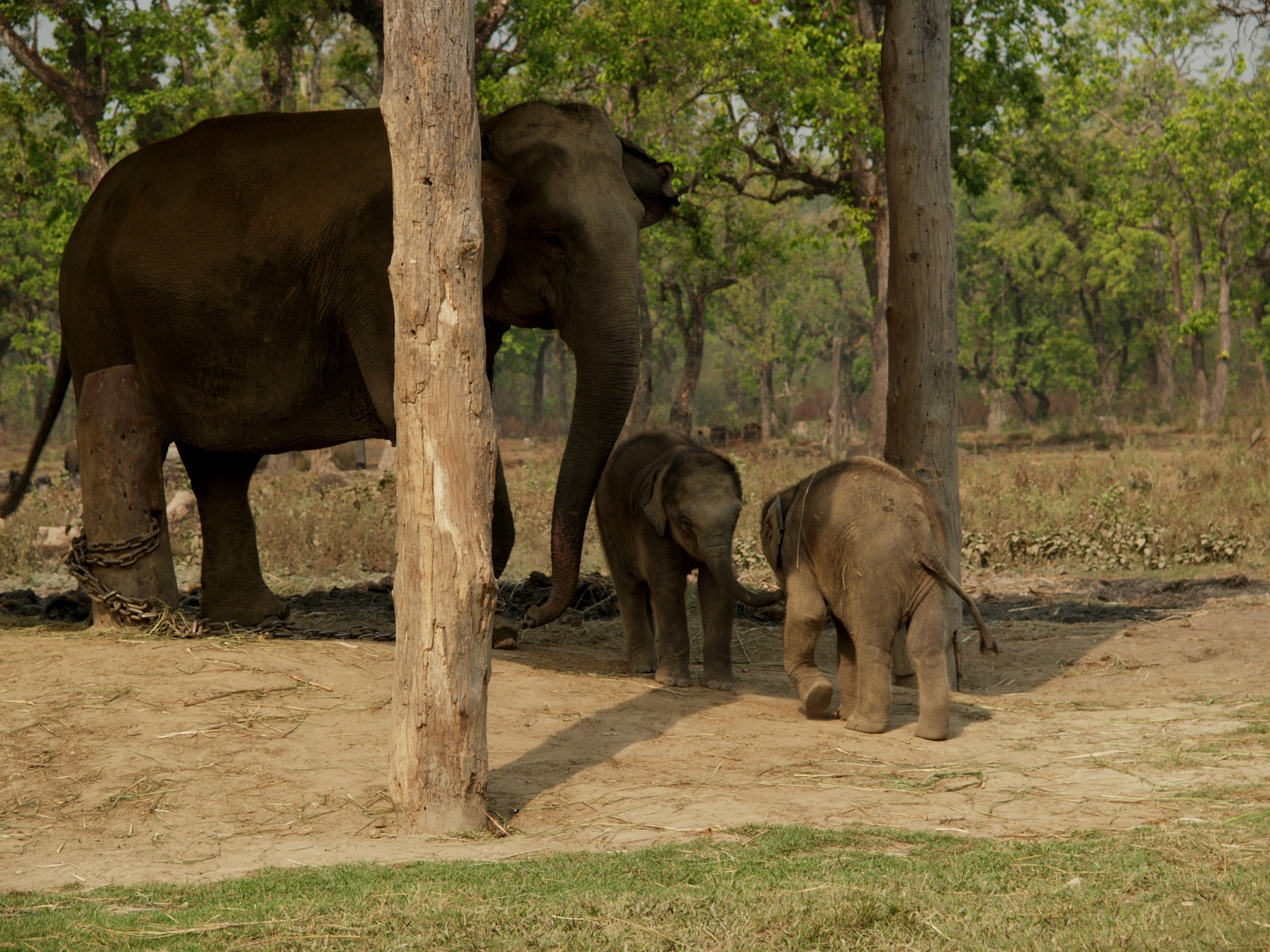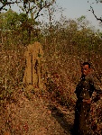 Irgendwann kommen wir dann zur Elefantenaufzuchtsstation. Kaum sind wir da, sind die beiden Lehrerinnen fort und Gopal zeigt mir noch einen riesigen Termitenbau. Er kann es nicht verstehen, daß alle Touristen nur die kleinen Elefanten sehen wollen, wo doch Termiten genauso ein Teil der Schöpfung sind. Wobei diese kleinen Elefanten schon etwas Besonderes sind, da ist zum Beispiel ein Zwillingspärchen mit einem halben Jahr. Bei uns im Tierpark wäre das eine Sensation aber hier ist das ganz normal und es ist nicht mal ein Zaun zwischen den Besuchern und den Elefanten, einzig die Mutter hat eine Kette um einen Fuß. Gopal erklärt auch, daß die Ausbildung der Elefanten sehr lange dauert und auch sehr hart ist.