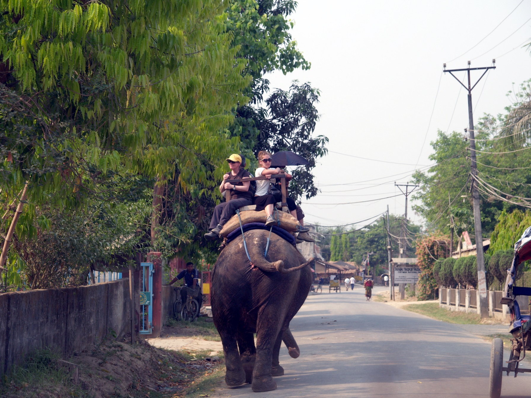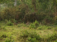 Passagieren der gemütlich auf der Strasse trottet und es ist so normal, als ob man bei uns einen Bus mit Fahrgästen sehen würde. Im Hotel werde ich sehr freundlich aufgenommen und man erzählt mir, daß der Besitzer ein Deutscher sei und daß es zum Frühstück deutschen Kaffee gibt. Ich beziehe ein tolles Zimmer und dann gibt es auch schon Mittagessen. Dannach lerne ich Gopal kennen, einen Mann, der sich um die Gäste kümmert und der hier jeden Baum, Strauch und jeden Vogel kennt. Er sagt mit, daß er mich so gegen 16:00 Uhr zu einer Führung durch das Dorf und den angrenzenden Dschungel abholen wird und er meint ich soll doch