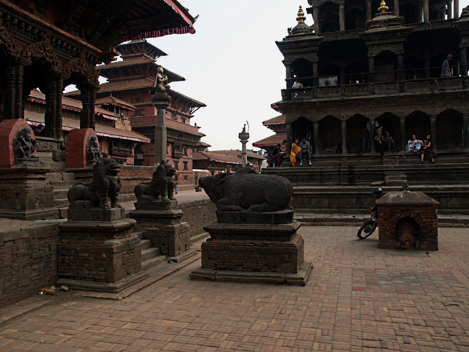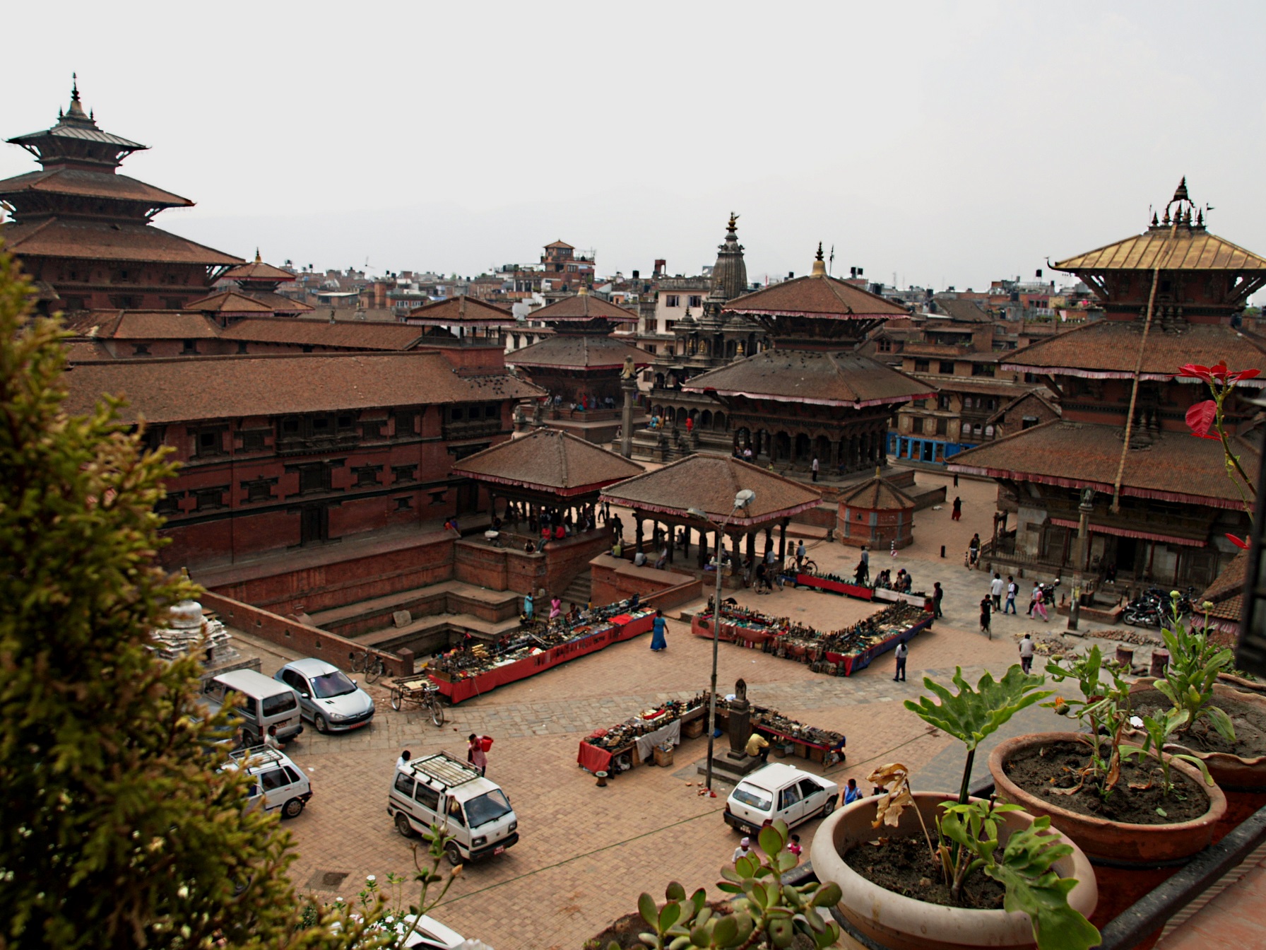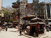 ein geflügeltes Wort. Die T-Shirts sind fertig geworden, sie sehen gut aus und haben pro Stück 2 Euro gekostet. Weiter geht es zum 'Durbar Square', einer weiteren Königsstadt mitten in Kathmandu. Diese Königstadt ist mehr als 1000 Jahre alt, bei uns wäre das alles ein Museum und abgesperrt. Hier ist Leben inmitten dieser Tempel und Paläste aus alten Zeiten. Und dann passiert es Dorche, einem Mann der sehr peinlich auf seine Schuhe achtet, daß er in einen Haufen Hundedreck tritt. Sein Gesicht verzerrt sich, und ich sage zu ihm im Spaß er soll doch seinen Schuhe am Fell einer Kuh die hier so ganz einfach rum liegen saubermachen. Er schaut mich an zwinkert und sagt: 'My life should not end at the next tree by hanging of a Hindu'.