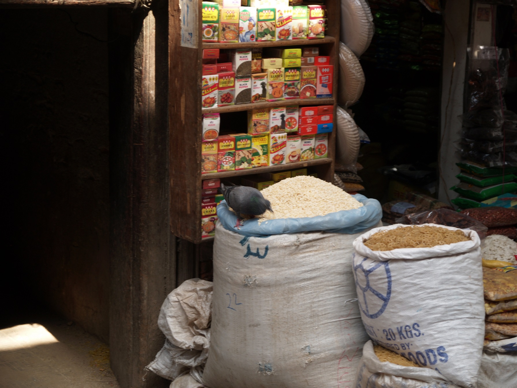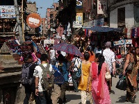 Stimmt! Er putzt die Schuhe notdürftig am Pflaster ab und wir kaufen uns ein Bier. Nach dem 'Durbar Square' kommt dann noch der 'Nepali Market' mit seinen Läden und Ständen in denen die Einheimischen einkaufen. Die Frauen stehen vor den Stoffläden Schlange und es riecht überall nach Gewürzen und Tee. Ich kaufe Tee und Gewürze und überlege wie ich das Ganze in meinen Rucksack und in der Reisetasche unterbringe. Natürlich müssen auch noch zwei Flaschen Everest und eine Flache 'Green-Chili' in den Rucksack. Dorche glaubt sowieso, daß ich ein Chili-Chunkie bin, aber ich stehe total auf diese Sauce. Dann kommt de Abschied, wir beide stehen uns gegenüber und wissen, dass wir in diesen vier Wochen