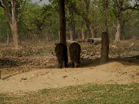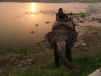 Elefanten wagen würde und die Krokodile würden sowieso gut satt werden, da es hier viele Fische gibt. Nach dem Mittagessen und einem kleinen Schläfchen steht dann das Highlight des Tages an. Es gibt einen Ausflug auf dem Rücken eines Elefanten und wenn wir Glück haben bekommen wir dabei wild lebende Nashörner zu sehen. Bevor ich gegen 16:00 Uhr mit einem Jeep zum 'Elefantenbahnhof' gebracht werde hat Gopal noch einen wichtigen Tipp für mich. Ich soll ja zum Schutz vor Dornen und Ästen lange Hosen und ein langes Hemd anziehen, da es einem Elefanten egal ist, ob Äste oder Dornen im Weg sind. Am 'Elefantenbahnhof' liegen mehrere Elefanten auf dem Boden und warten, daß die Fahrgäste