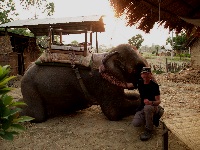 Elefantenbahnhof sind fragt uns unser Mahout ob wir lieber mit dem Jeep zurück fahren wollen oder ob wir gemeinsam zum Hotel zurück reiten. Wir entscheiden uns für den Rückweg auf dem Elefanten. Ich frage mich Unterwegs nur wie das mit dem Absteigen funktionieren soll. Als wir dann schließlich angekommen sind, öffnet die Frau des Mahout auf dem Balkon ein Tür'l und Buddha muss rückwärts einparken, was einwandfrei funktioniert. Aha, auch das gehört zu den 20 Kommandos die sich so ein Elefant merken kann, wie ich gelernt habe. Die beiden Lehrerinnen verzupfen sich so schnell sie können und ich tätschle dem Elefanten noch das Ohr, denn wann hat man schon sonst so eine Gelegenheit. Am Abend gibt es dann noch eine Folkloredarbietung der Taro,
