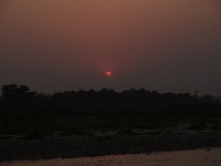 Es dämmert und mich weckt der Indische Kuckuck. Ich habe noch nie einen Vogel gehört, der so einen einprägsamen Ruf hat. Kein Wunder, daß dieser Vogel in indischen Erzählungen einen ähnlichen Status hat wie bei uns die Nachtigall. Also raus aus den Federn und rein in die Klamotten um 6:00 Uhr geht es ohne Frühstück zum Fluss. Dort angekommen, besteigen wir einen Einbaum und Gopal sagt zu einer der Lehrerinnen, die beim Einsteigen ziemlich wackelt: 'hold the balancy, the crocodiles are hungry this morning'. Die beiden Frauen versteinern umgehend und haben an der Flussfahrt überhaupt keinen Spaß mehr. Die Fahrt auf dem Fluss ist klasse, wir sehen Gaviale, das sind indische Krokodile,