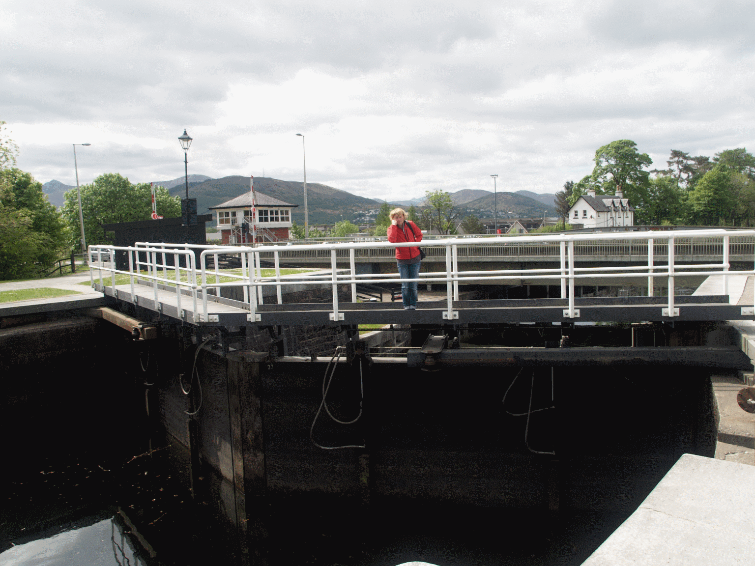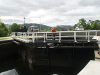 1803 begann man mit den Arbeiten für den Kanal der den Atlantik mit der Nordsee verbindet. 19 Jahre später war das Bauwerk mit seinen 29 Schleusen auf knapp 100 Kilometer, von denen aber nur ein Drittel künstlich hergestellt werden musste, da der Rest natürliche Seen sind, fertig. In Banavie stoßen wir wieder auf den Kanal mit 'Neptuns Stairway', das sind acht Schleusen. Wir schauen zu, wie mehrere Segelboote und ein größeres Motorboot über die Schleusen nach unten zum Loch Lochy gebracht werden. Hier könnte man einen ganzen Tag stehen und zuschauen.