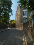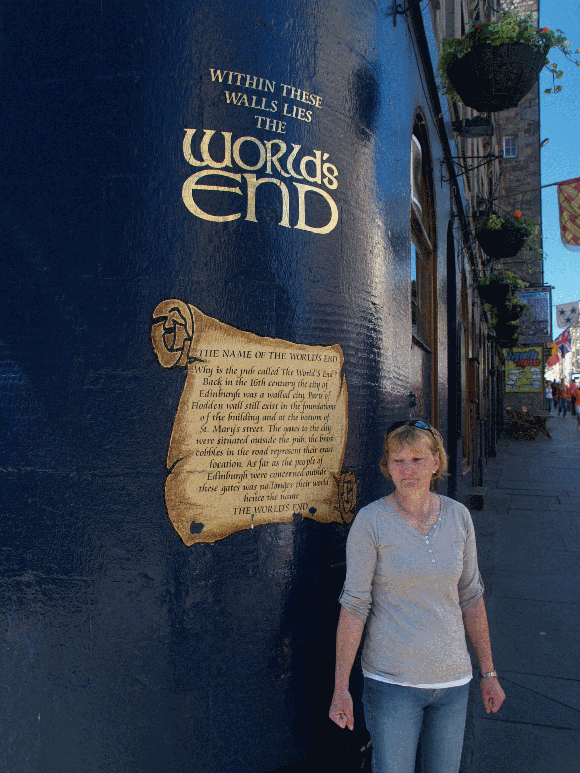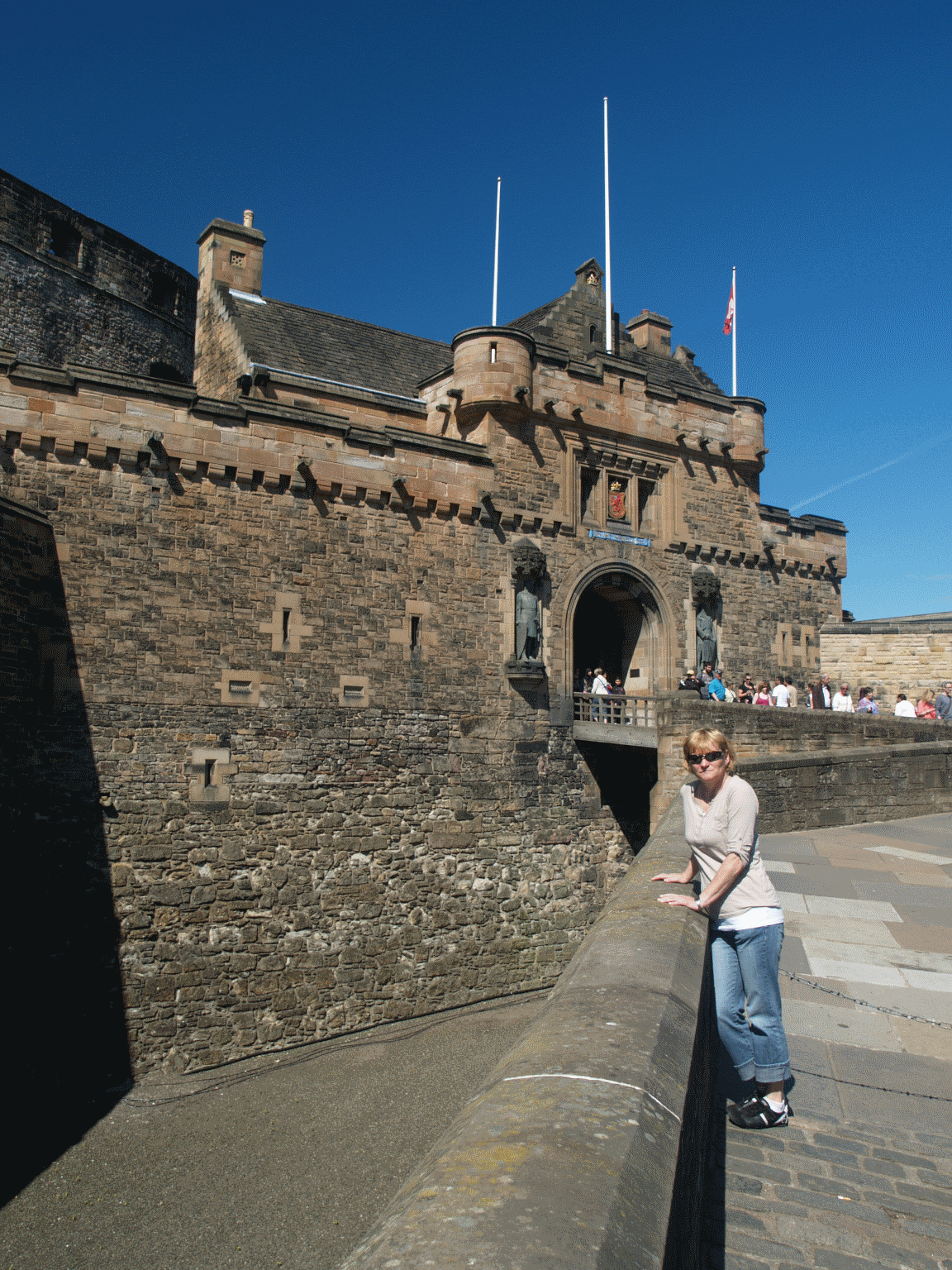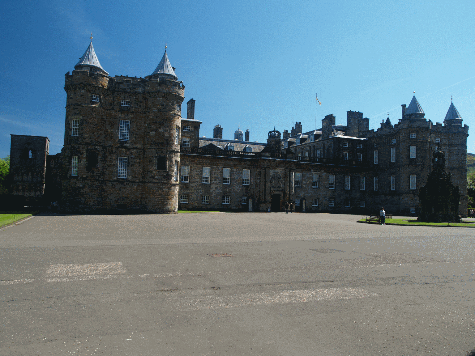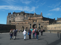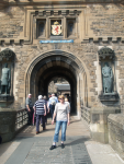 Vor dem Edinburg-Castle trifft uns fast der Schlag, wir sind noch recht früh dran, aber dort stehen die Menschen bereits in 3er Reihen um Eintrittskarten an. Es ist zwar schade, aber was zuviel ist ist zuviel, wir drehen um und begeben uns auf die Royal Mile, eine Straße die vom Castle bis zum Palace of Holyroodhouse, dem Sitz der englischen Königin in Schottland führt. Rechts und links alte Häuser, Läden und Kneipen. Der blaue Himmel ist heute der perfekte Hintergrund zu den alten Gebäeuden mit den vielen englischen und schottischen Fahnen.