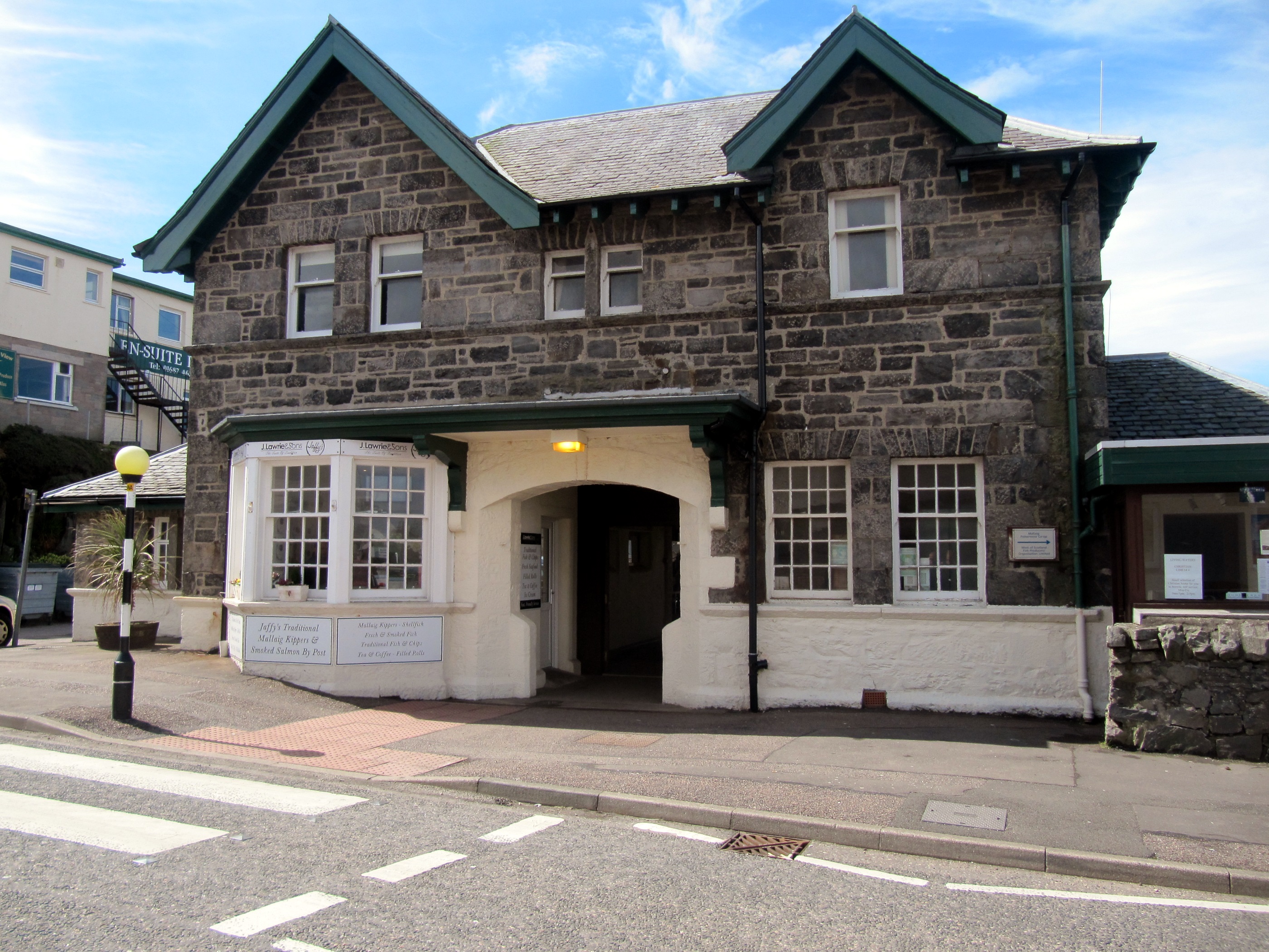 In Malleigh kümmern wir uns erstmal um die Tickets für die Fähre, wir bummeln ein bisschen und sehen auch den ersten schottischen Herrn im Kilt. Im 'The Cabins' kaufen wir uns dann unsere erste Portion Fish and Chips, es wird jede Portion frisch gemacht und so sitzen wir dann in der Sonne und genießen dieses englische Fastfood.