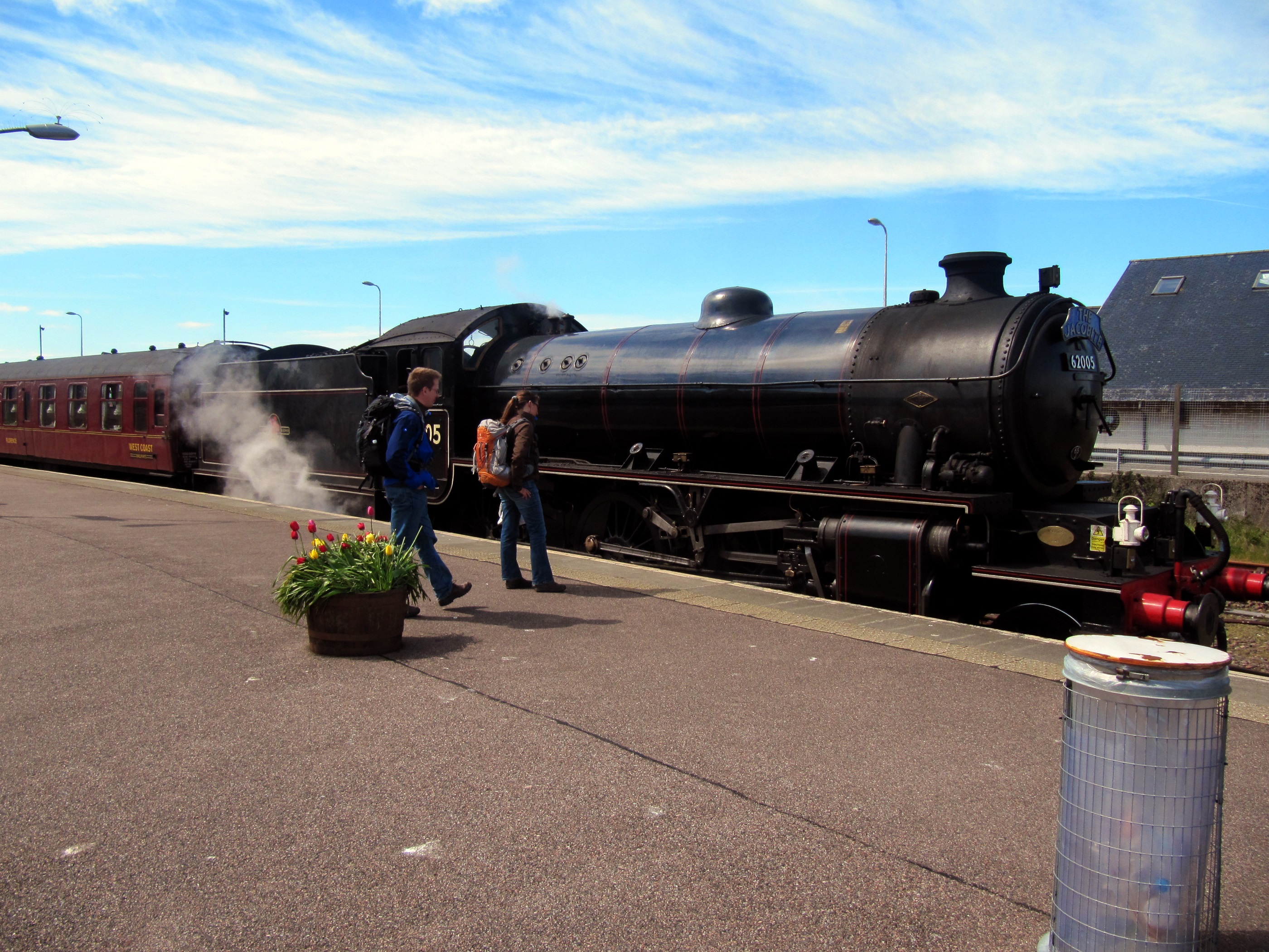 Auf dem Rückweg zum Parkplatz kommen wir dann am Bahnhof vorbei und dort steht er dann, dieser 'Jacobite Steamtrain', der Dampfzug der auch aus den Harry-Potter-Filmen bekannt ist. Scheinbar sind die Fahrten von Fort William nach Malleigh sehr gefragt, denn die Waggons sind voll besetzt.