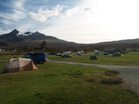 Von Armadale aus geht es dann Richtung Broadford, hier sieht es aus wie in Amerika. Ene schnurgerade Straße in einsamer Landschaft. Kurz darauf sind wir für heute am Ziel, an einer Straßenkreuzung liegen das Sligachan Hotel and Campsite.