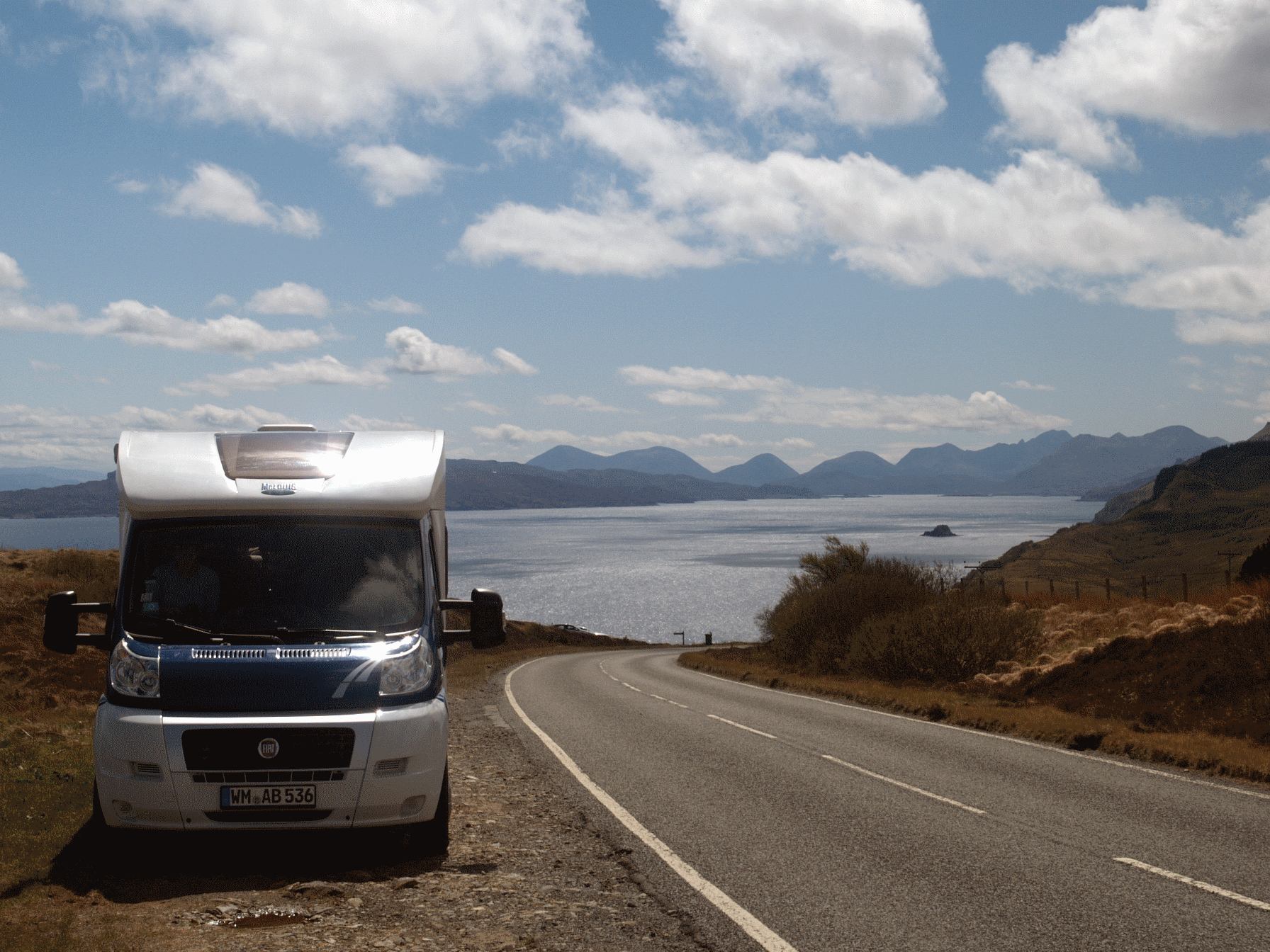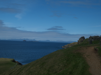 Heute ist es wunderbar warm, es scheint gleich in der Früh die Sonne und es ist richtiges T-Shirt Wetter. Wir fahren wieder Richtung Portree, und dann geht es weiter in den Norden der Isle of Skye. Vom weitem sieht man schon den 'Old Man of Stoer', eine Felsnadel am Rande des mit 725 Metern höchsten Bergmassives im Norden von Skye. Zum ersten mal fahren wir über 'Single Track Roads', aber dank der vielen Ausweichstellen ist das nirgends ein Problem.