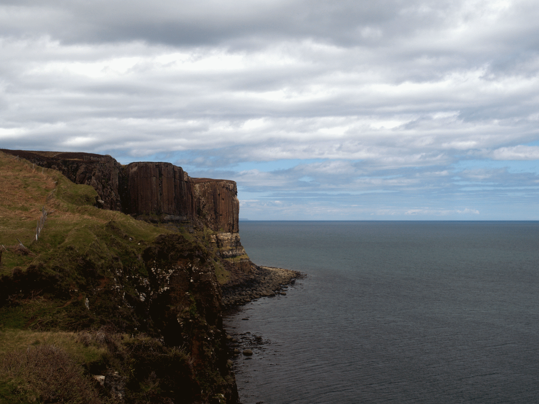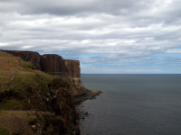 Weiter geht die Fahrt um die Nordseite von Skye zum 'Kilt Rock' einer Steilküstenformation, die aussieht wie ein gefalteter Kilt. Direkt am Parkplatz stürzt ein Wasserfall 80 Meter in die Tiefe. Die Ausblicke auf das Meer sind gewaltig.