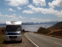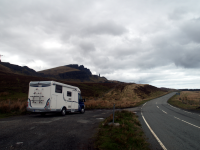 Am Ortsrand von Dunvegan finden wir einen Campingplatz, der wieder schön an einer Bucht liegt. Der Mann von der Rezeption geht mit mir zum Stellplatz und zeigt mir alles. Auf meine Aussage hin, daß es hier sehr schön ist, meinte er lächelnd, ich soll lieber bis Morgen Früh warten, denn in der Nacht kommt ein heftiger Sturm. Später stellen sich dann noch eine Frau und ein Mann aus Australien neben uns. Sie sind bestimmt schon über 70 und sie sind seit einem Jahr mit einem Camper aus Australien bis hierher unterwegs, sie möchten die Wurzeln ihrer Familien sehen. Da sie in ihrem Camper kein Platz zum kochen haben, erledigen sie das bei beginnenden Regen im Abspühlraum. Da wir dort auch gerade beim spülen sind, vergeht der frühe Abend bei einem interessanten Gespräch.