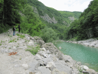 Markus und Rudi überlegen ob sich die Soca hier zum Flußtauchen eignen würde.
