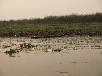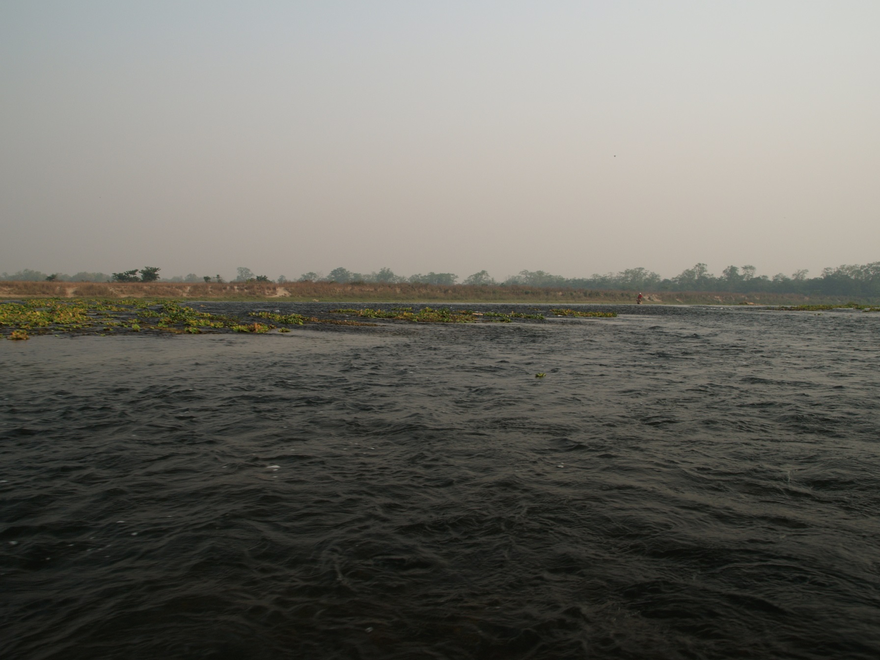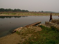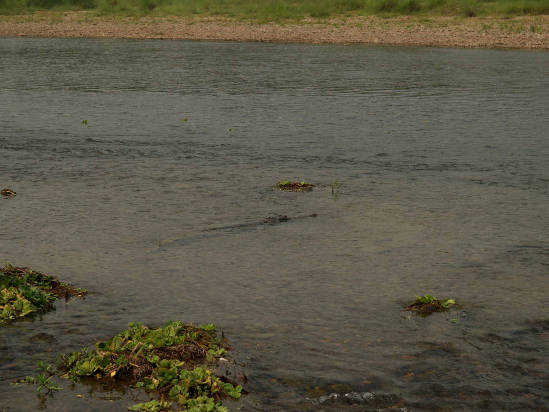 Es dämmert und mich weckt der Indische Kuckuck. Ich habe noch nie einen Vogel gehört, der so einen einprägsamen Ruf hat. Kein Wunder, daß dieser Vogel in indischen Erzählungen einen ähnlichen Status hat wie bei uns die Nachtigall. Also raus aus den Federn und rein in die Klamotten um 6:00 Uhr geht es ohne Frühstück zum Fluss. Dort angekommen, besteigen wir einen Einbaum und Gopal sagt zu einer der Lehrerinnen, die beim Einsteigen ziemlich wackelt: 'hold the balancy, the crocodiles are hungry this morning'. Die beiden Frauen versteinern umgehend und haben an der Flussfahrt überhaupt keinen Spaß mehr. Die Fahrt auf dem Fluss ist klasse, wir sehen Gaviale, das sind indische Krokodile,