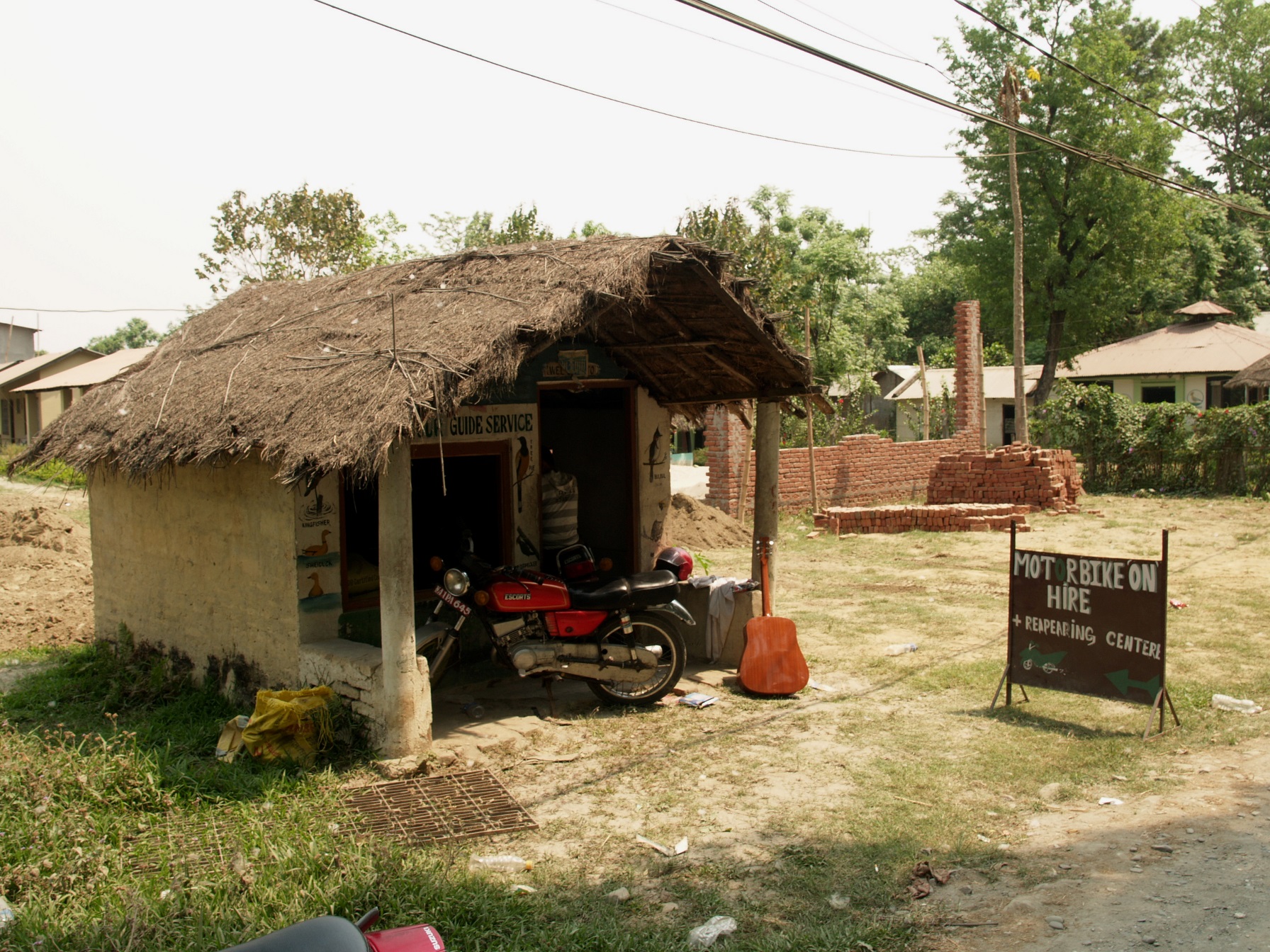 Chitwan ist im Süden Nepals und grenzt dort an Indien. Wir fahren nach Sauraha, einen Ort im ehemaligen Jagdgebiet der nepalischen Rajas. Hier gibt es Tiger, Elefanten Leoparden und Nashörner. Ich kann es immer noch nicht glauben, daß es diese Tiere in Nepal gibt. Am Ortsende von Pokhara sehe ich ihn dann doch, Machapuchare, dieser geheimnisvolle Berg sieht schon sehr majestätisch aus. Auf halbem Weg steigt Dorche dann aus um mit dem Bus alleine zurück nach Katmandu zu fahren. Ich fahre nun mit dem Fahrer, der so gut wie kein Englisch kann, weiter nach Sauraha. Die Landschaft ändert sich immer mehr und es wird immer trockener und wärmer. Nach gut drei Stunden kommen wir dann in Sauraha an und das erste das ich sehe ist ein Elefant mit