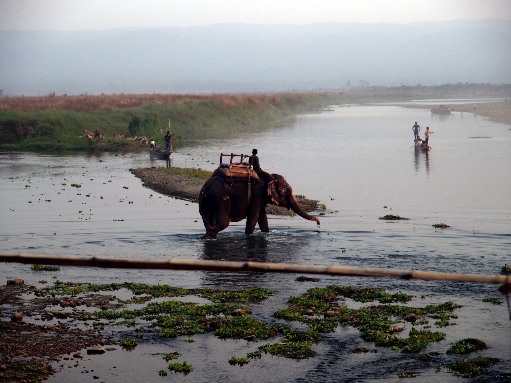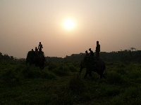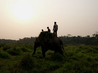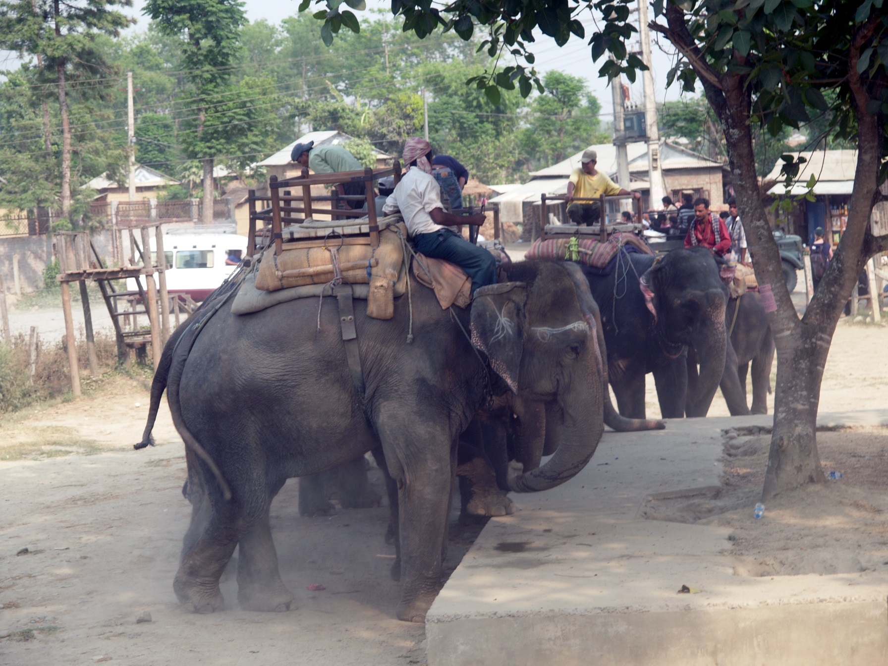 Elefanten wagen würde und die Krokodile würden sowieso gut satt werden, da es hier viele Fische gibt. Nach dem Mittagessen und einem kleinen Schläfchen steht dann das Highlight des Tages an. Es gibt einen Ausflug auf dem Rücken eines Elefanten und wenn wir Glück haben bekommen wir dabei wild lebende Nashörner zu sehen. Bevor ich gegen 16:00 Uhr mit einem Jeep zum 'Elefantenbahnhof' gebracht werde hat Gopal noch einen wichtigen Tipp für mich. Ich soll ja zum Schutz vor Dornen und Ästen lange Hosen und ein langes Hemd anziehen, da es einem Elefanten egal ist, ob Äste oder Dornen im Weg sind. Am 'Elefantenbahnhof' liegen mehrere Elefanten auf dem Boden und warten, daß die Fahrgäste