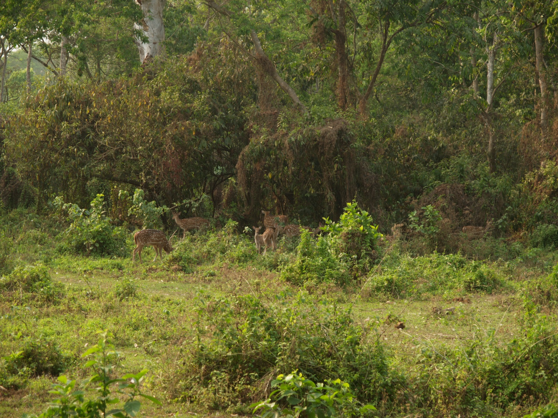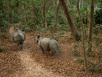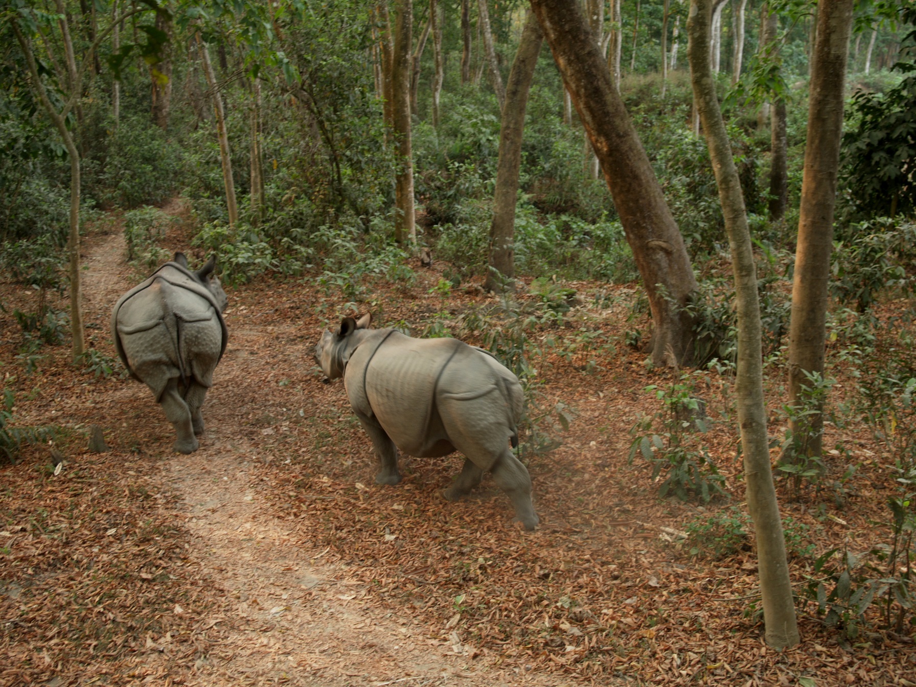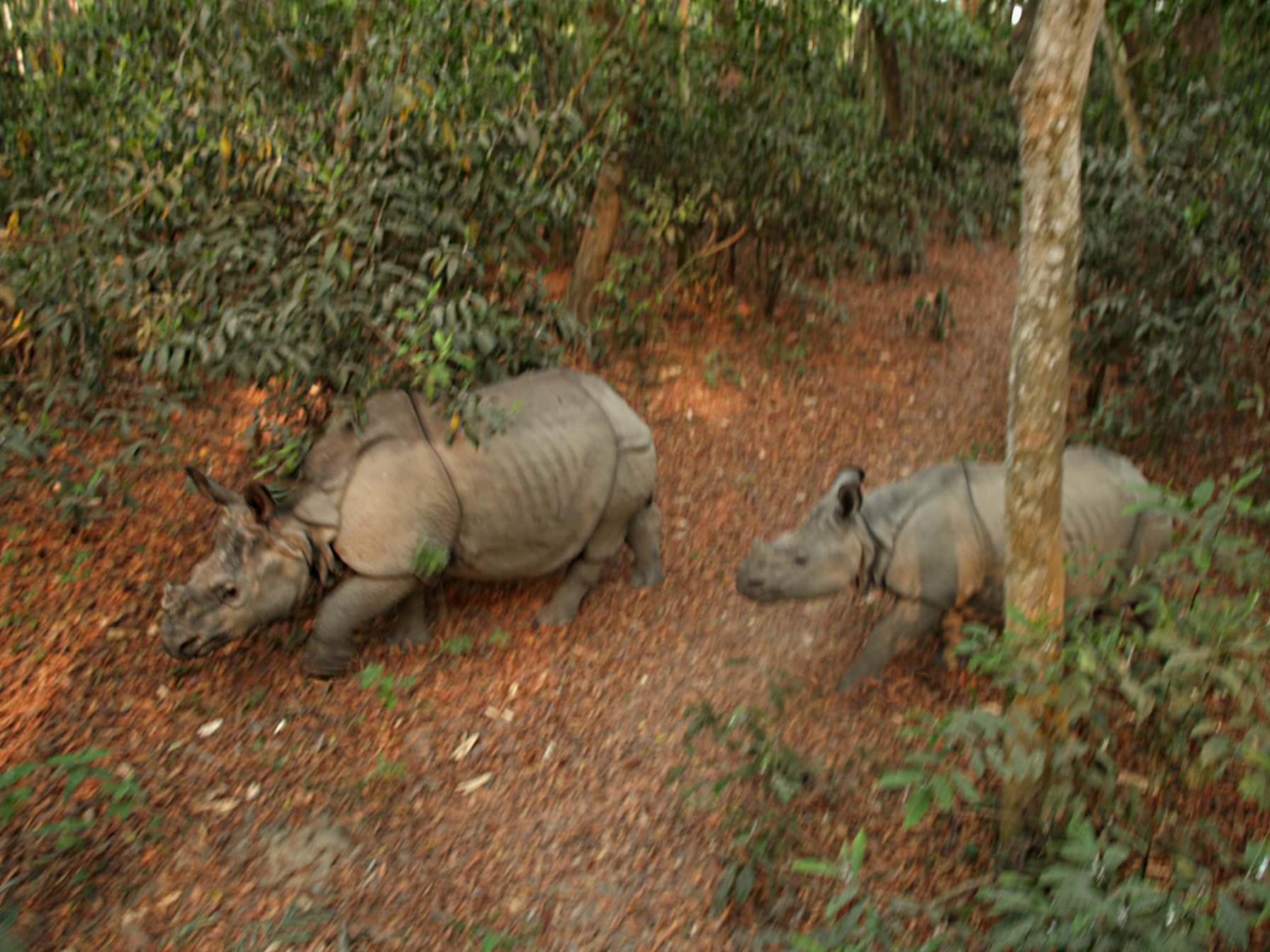das überhaupt nicht mit und ich sehe mich schon unter der Plattform begraben. Der Mahout steigt auf den Nacken des Elefanten und verknotet die Seile einfach wieder, na hoffentlich hält das. Wir sehen Pfaue, wilde Hühner und 'pointet deers', kleine gepunktete Hirsche. Wir sehen aber auch Nashörner und das aus unmittelbarer Nähe. Unser Mahout hat damit kein Problem, denn er erklärt, daß kein Tier aus dem Dschungel einen ausgewachsenen Elefanten angreifen würde.