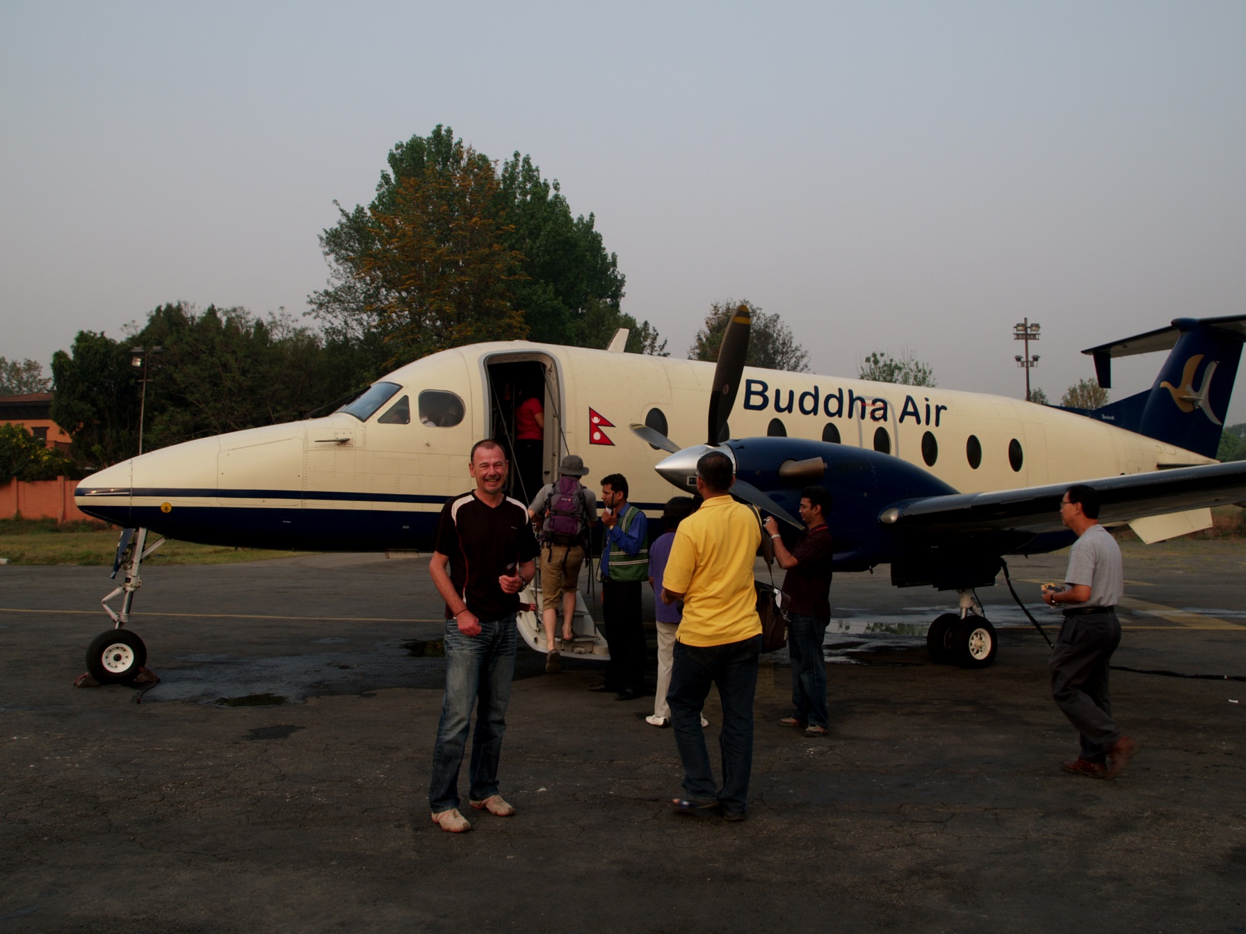 am Abflugschalter nach Lucla einfinden. Die fliegen alle zum Ausgangspunkt für den Trek zum Mt. Everest und mein Urlaub ist so gut wie vorbei. Bei aller Freude auf Zuhause kommt hier schon so etwas wie Neid auf. Irgendwann nach 07:00 Uhr, geht es dann los. Mein Moutainflight wird aufgerufen, wir gehen über das Rollfeld zu der 'Buddah-Air Maschine'. Die ist eine 2-motorige Piper mit 18 Sitzplätzen und 9 Fenstern auf jeder Seite, somit hat jeder Fluggast einen Fensterplatz. Das ist aber den japanischen Fluggästen egal, sie drücken sich bei jeder Gelegenheit an das Fenster von dem sie glauben, daß sie von hier aus den besseren Schnappschuss machen können. Kurz nach dem Start stellen sich dann die Pilotin und die Copilotin vor.
