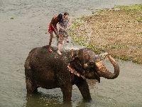 Aber wenn ein Elefant das hinter sich gebracht hat, dann hat er ein Leben lang einen Beschützer in seinem Mahout und der wird dafür sorgen, daß es ihm gut geht. Mittag steht dann ein Bad mit den Elefanten auf dem Programm. Ich kann mir erstmal nichts darunter vorstellen aber es ist toll zu sehen wie vorsichtig sich die Elefanten mit den Menschen auf dem Rücken in das Wasser legen und sie dann mit Wasser aus dem Rüssel abduschen, und das alles für einen Euro. Mich wundert nur eines, keine 10 Meter oberhalb der Badestelle liegt ein ca.2 Meter langes Krokodil im Wasser und keiner schert sich etwas drum. Auf meine Frage warum das so ist, meint Gopal nur, daß sich ein Krokodil nie in die Nähe eines