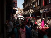 Stimmt! Er putzt die Schuhe notdürftig am Pflaster ab und wir kaufen uns ein Bier. Nach dem 'Durbar Square' kommt dann noch der 'Nepali Market' mit seinen Läden und Ständen in denen die Einheimischen einkaufen. Die Frauen stehen vor den Stoffläden Schlange und es riecht überall nach Gewürzen und Tee. Ich kaufe Tee und Gewürze und überlege wie ich das Ganze in meinen Rucksack und in der Reisetasche unterbringe. Natürlich müssen auch noch zwei Flaschen Everest und eine Flache 'Green-Chili' in den Rucksack. Dorche glaubt sowieso, daß ich ein Chili-Chunkie bin, aber ich stehe total auf diese Sauce. Dann kommt de Abschied, wir beide stehen uns gegenüber und wissen, dass wir in diesen vier Wochen