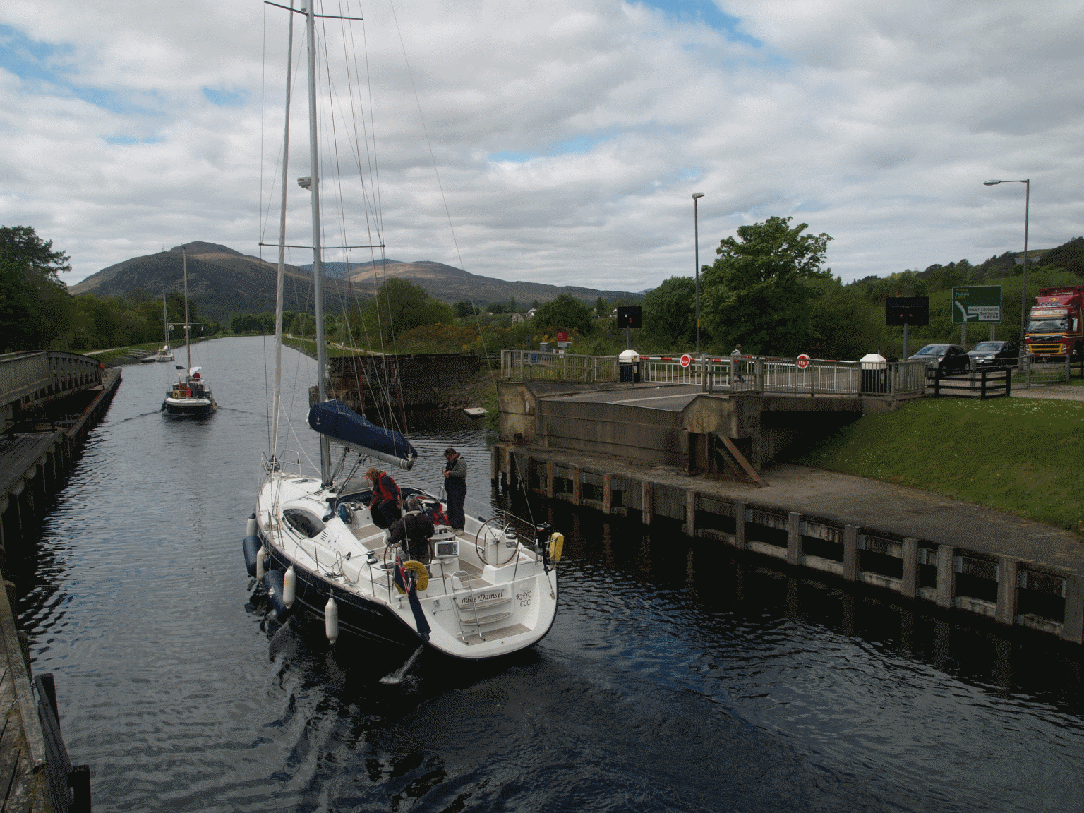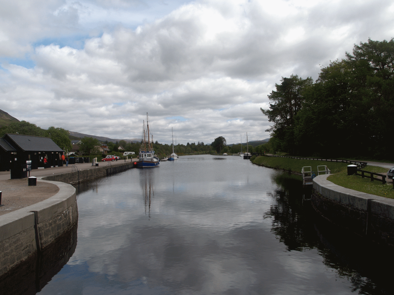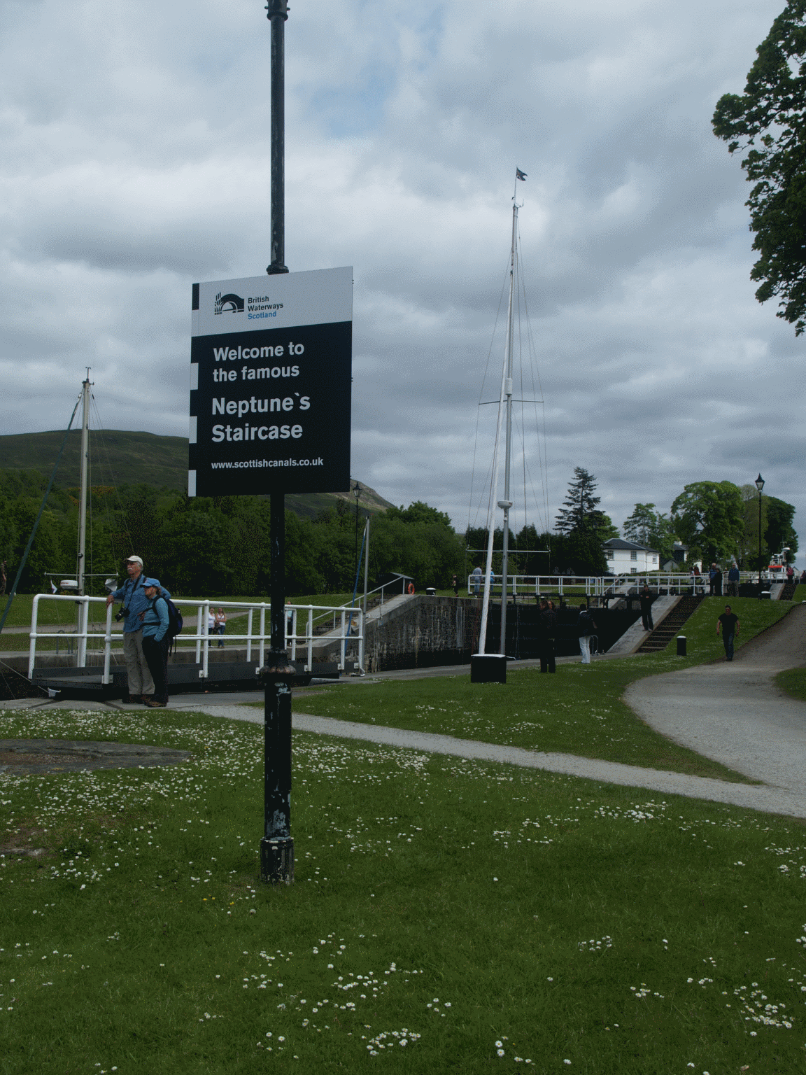 1803 begann man mit den Arbeiten für den Kanal der den Atlantik mit der Nordsee verbindet. 19 Jahre später war das Bauwerk mit seinen 29 Schleusen auf knapp 100 Kilometer, von denen aber nur ein Drittel künstlich hergestellt werden musste, da der Rest natürliche Seen sind, fertig. In Banavie stoßen wir wieder auf den Kanal mit 'Neptuns Stairway', das sind acht Schleusen. Wir schauen zu, wie mehrere Segelboote und ein größeres Motorboot über die Schleusen nach unten zum Loch Lochy gebracht werden. Hier könnte man einen ganzen Tag stehen und zuschauen.
