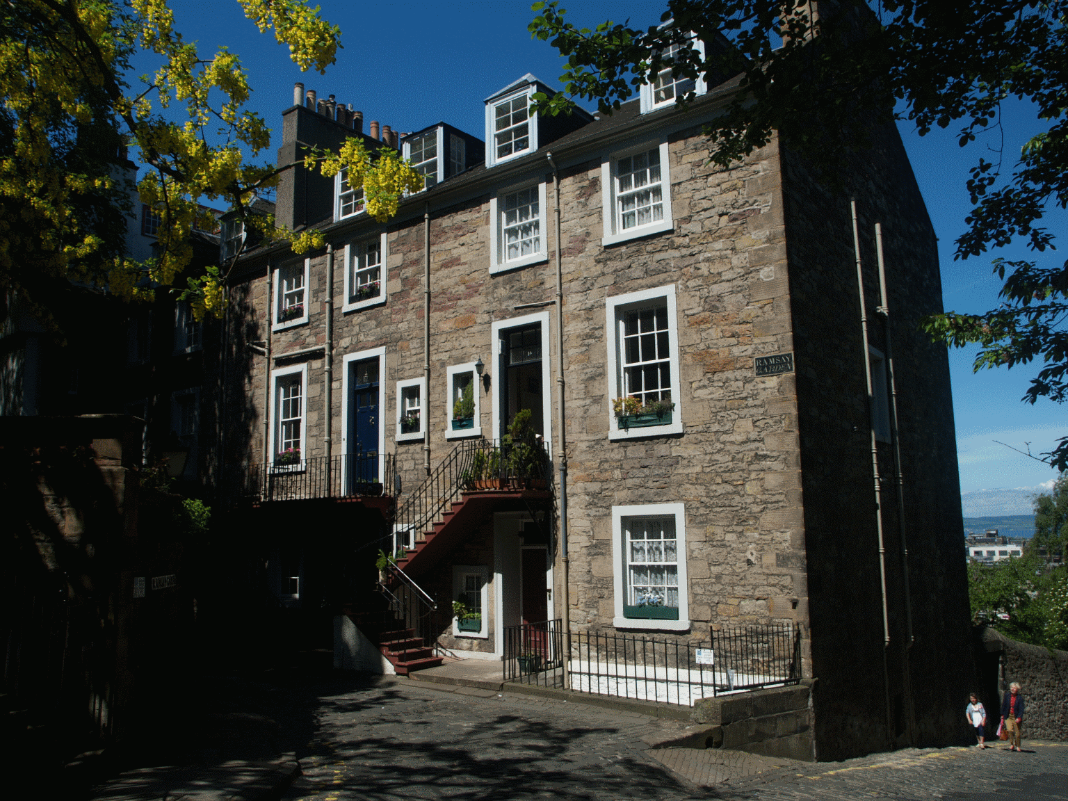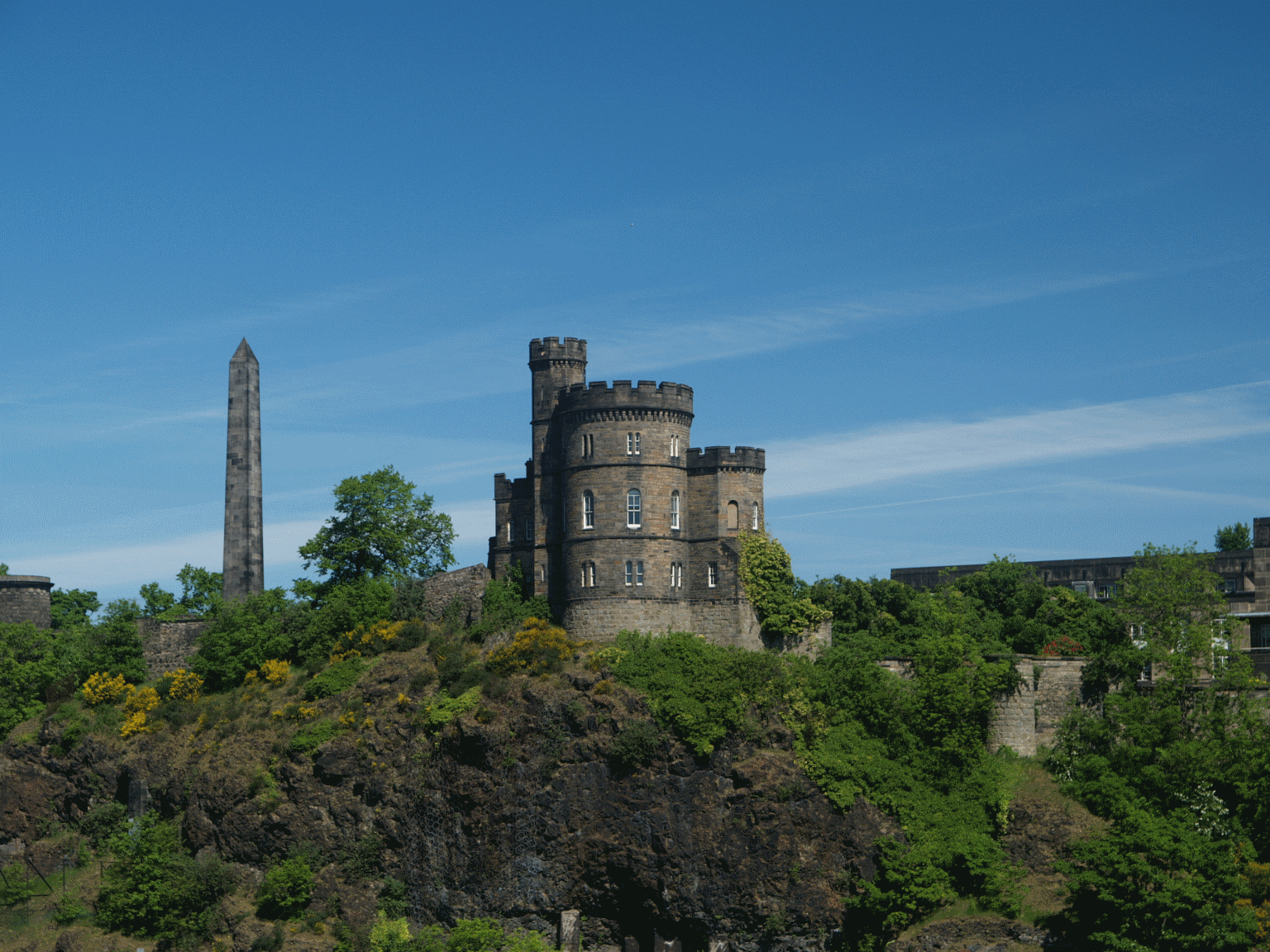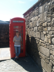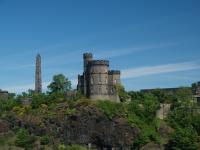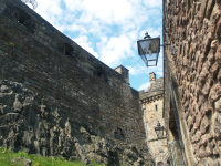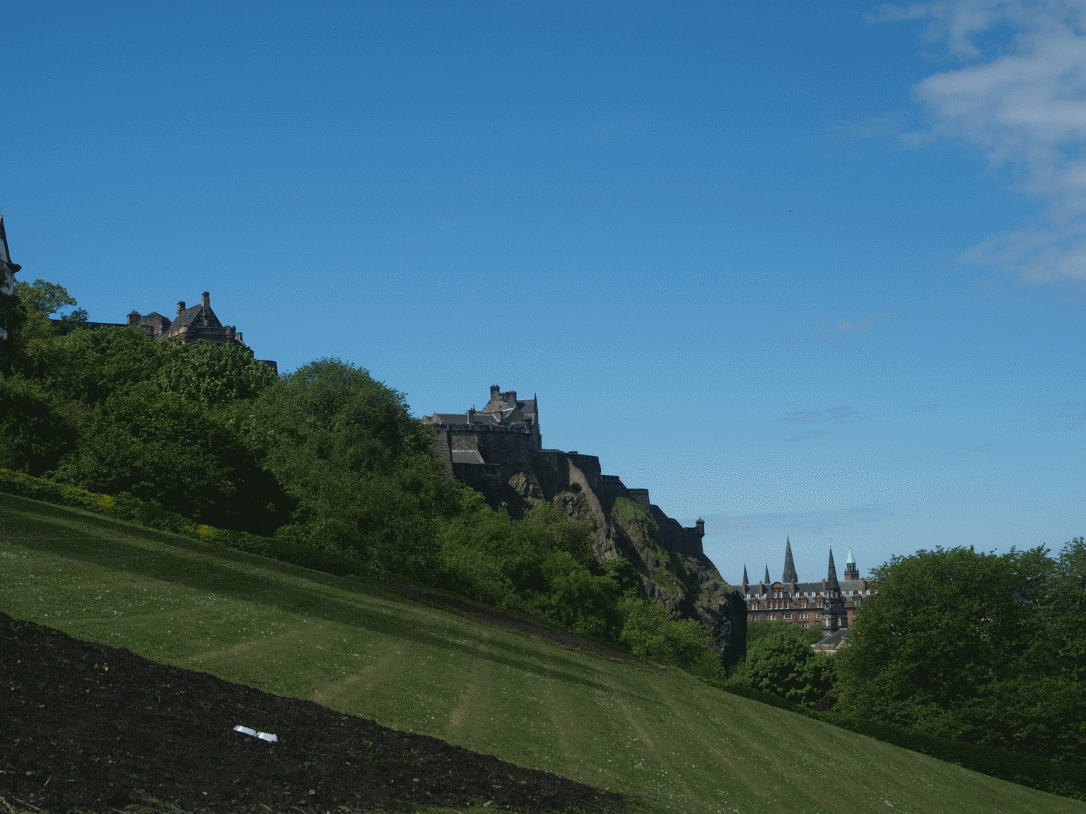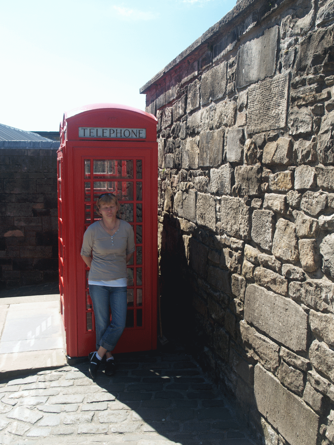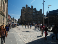 Vor dem Edinburg-Castle trifft uns fast der Schlag, wir sind noch recht früh dran, aber dort stehen die Menschen bereits in 3er Reihen um Eintrittskarten an. Es ist zwar schade, aber was zuviel ist ist zuviel, wir drehen um und begeben uns auf die Royal Mile, eine Straße die vom Castle bis zum Palace of Holyroodhouse, dem Sitz der englischen Königin in Schottland führt. Rechts und links alte Häuser, Läden und Kneipen. Der blaue Himmel ist heute der perfekte Hintergrund zu den alten Gebäeuden mit den vielen englischen und schottischen Fahnen.