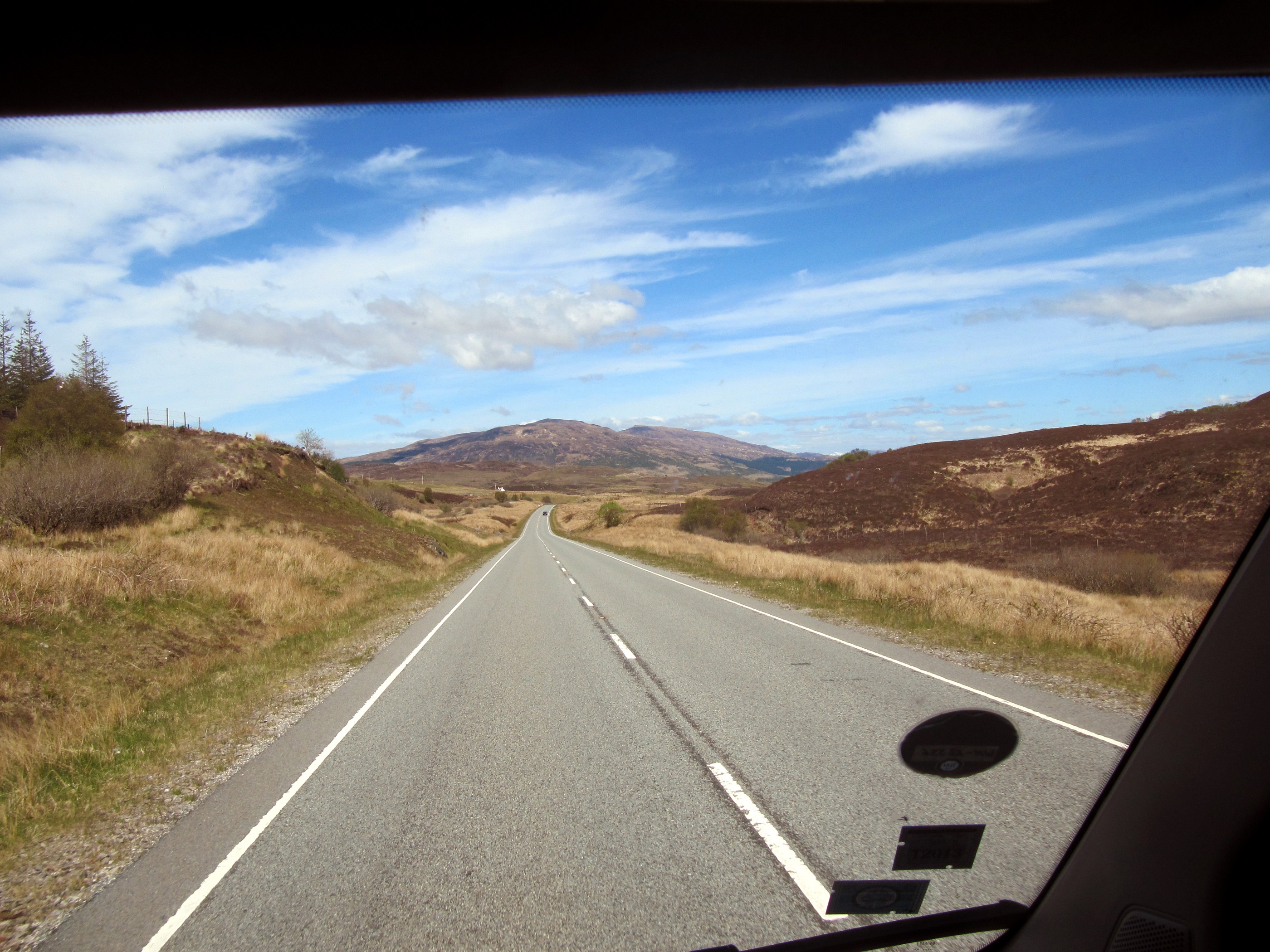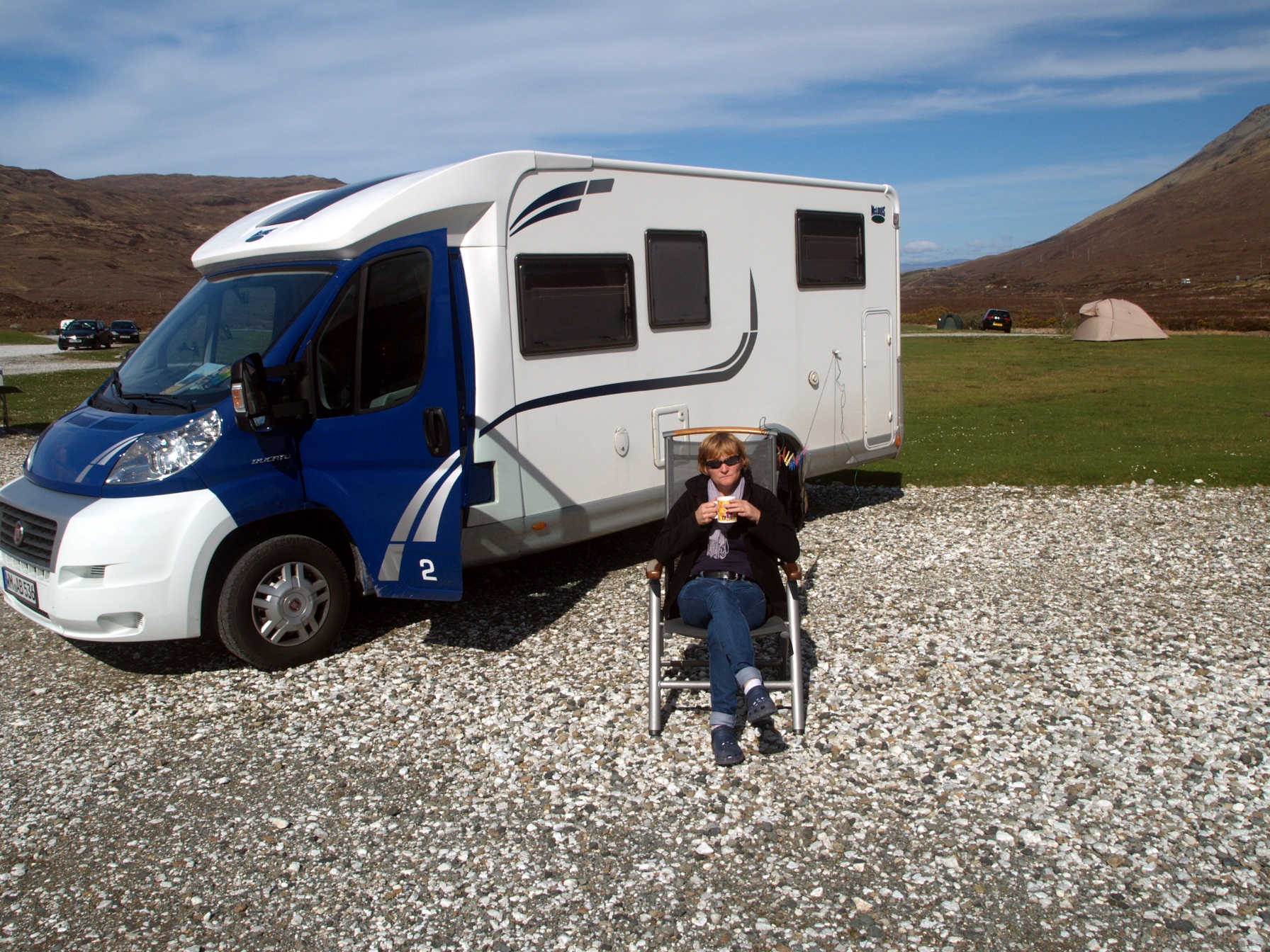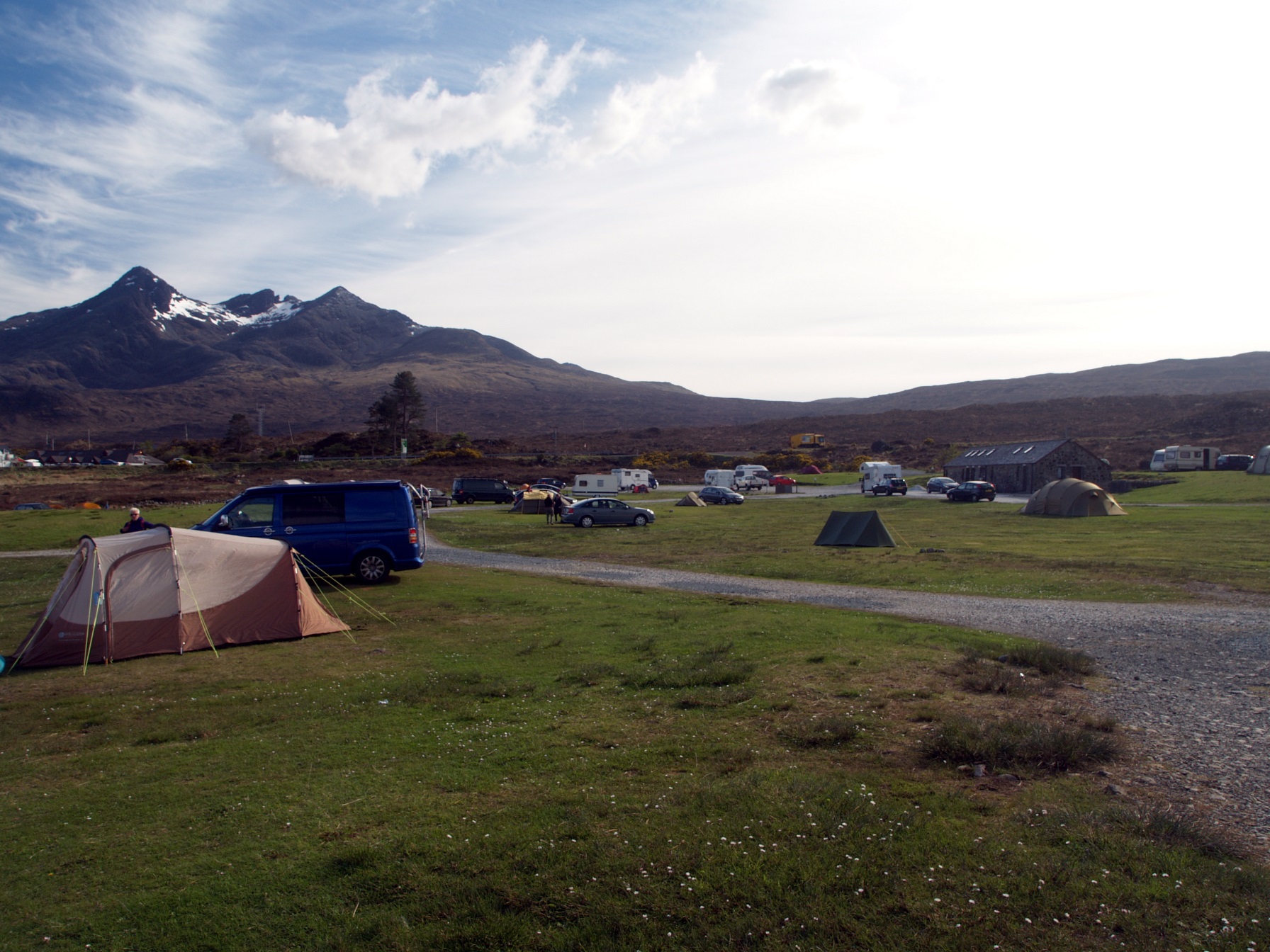 Von Armadale aus geht es dann Richtung Broadford, hier sieht es aus wie in Amerika. Ene schnurgerade Straße in einsamer Landschaft. Kurz darauf sind wir für heute am Ziel, an einer Straßenkreuzung liegen das Sligachan Hotel and Campsite.