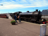 Auf dem Rückweg zum Parkplatz kommen wir dann am Bahnhof vorbei und dort steht er dann, dieser 'Jacobite Steamtrain', der Dampfzug der auch aus den Harry-Potter-Filmen bekannt ist. Scheinbar sind die Fahrten von Fort William nach Malleigh sehr gefragt, denn die Waggons sind voll besetzt.