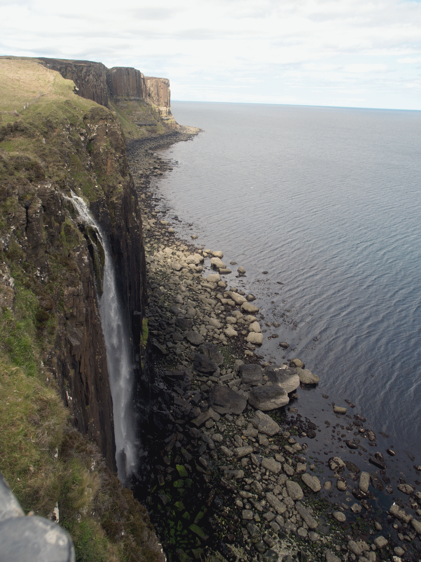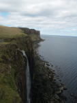Weiter geht die Fahrt um die Nordseite von Skye zum 'Kilt Rock' einer Steilküstenformation, die aussieht wie ein gefalteter Kilt. Direkt am Parkplatz stürzt ein Wasserfall 80 Meter in die Tiefe. Die Ausblicke auf das Meer sind gewaltig.