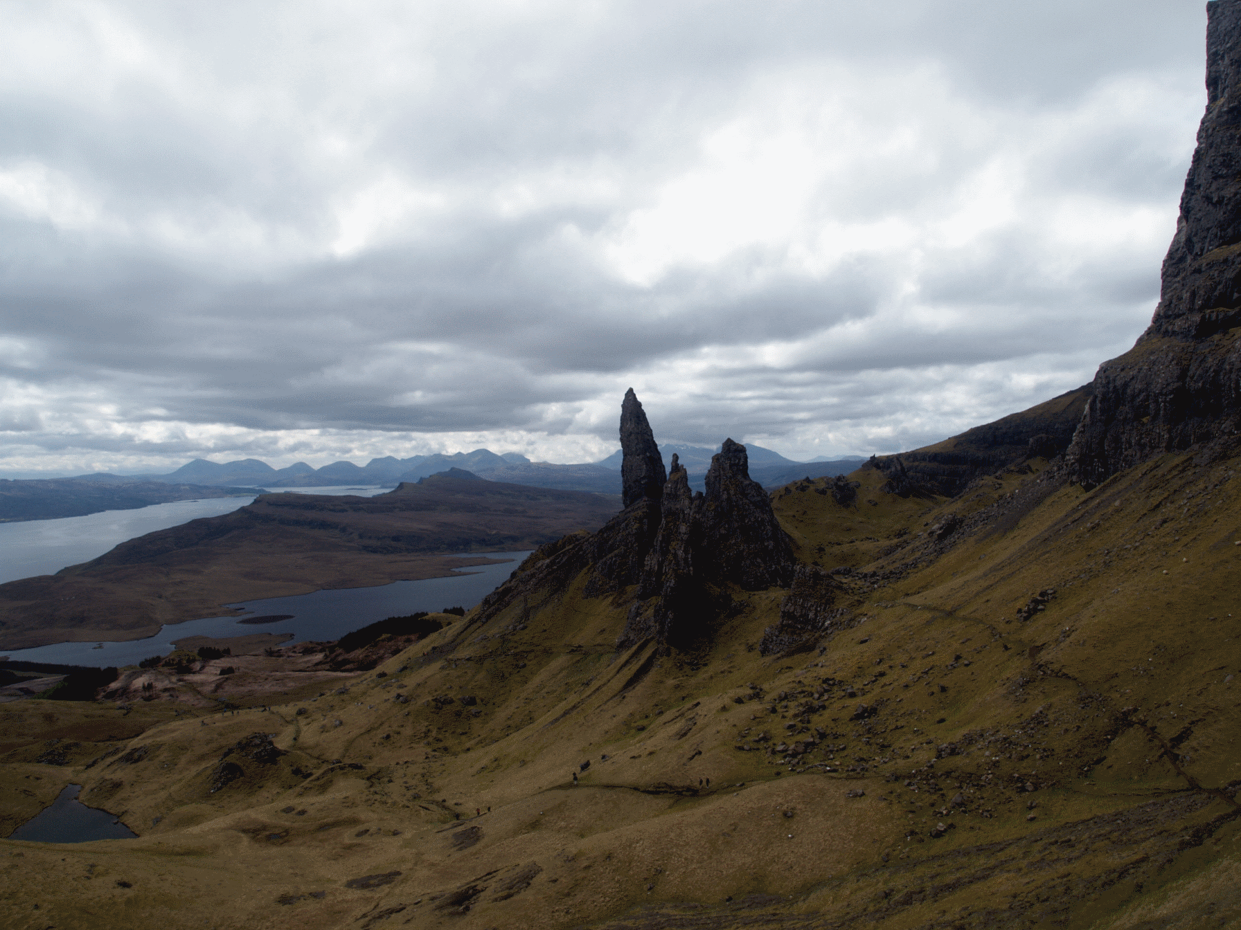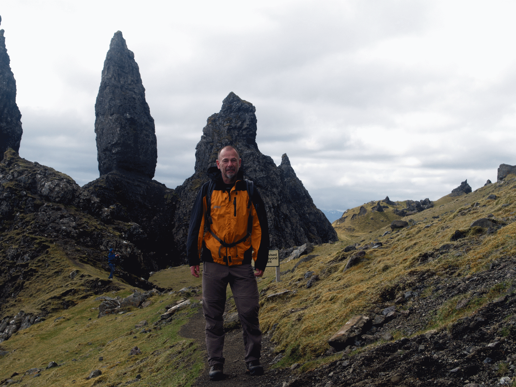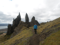 Heute ist es wunderbar warm, es scheint gleich in der Früh die Sonne und es ist richtiges T-Shirt Wetter. Wir fahren wieder Richtung Portree, und dann geht es weiter in den Norden der Isle of Skye. Vom weitem sieht man schon den 'Old Man of Stoer', eine Felsnadel am Rande des mit 725 Metern höchsten Bergmassives im Norden von Skye. Zum ersten mal fahren wir über 'Single Track Roads', aber dank der vielen Ausweichstellen ist das nirgends ein Problem.